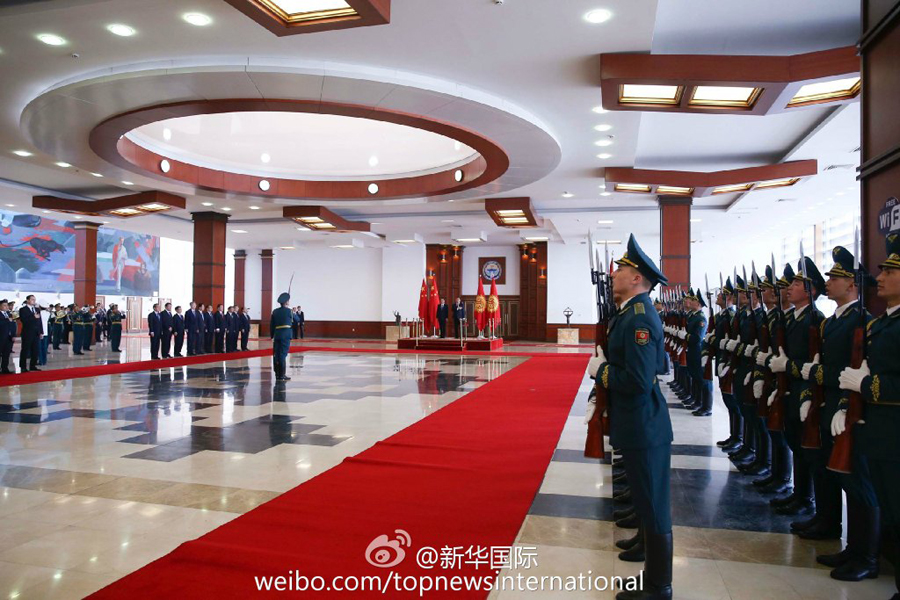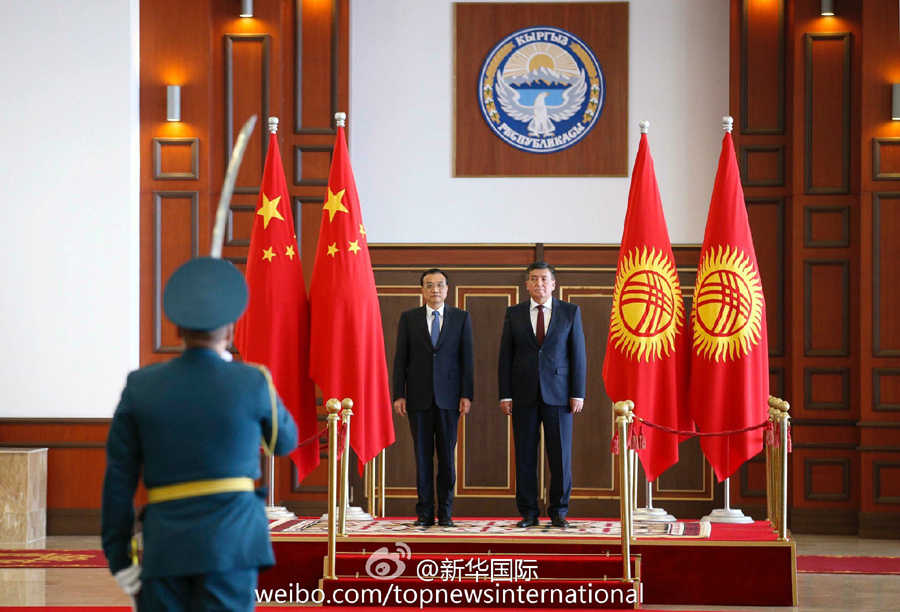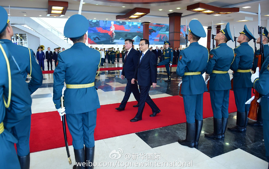 新华网北京11月2日电 李克强总理2日下午抵达吉尔吉斯斯坦首都比什凯克,吉总理热恩别科夫在机场贵宾大厅为李克强总理举行隆重的欢迎仪式。军乐队先后奏响中吉两国国歌,李克强在热恩别科夫陪同下,沿红地毯检阅仪仗队。(据“新华国际”微博报道)
