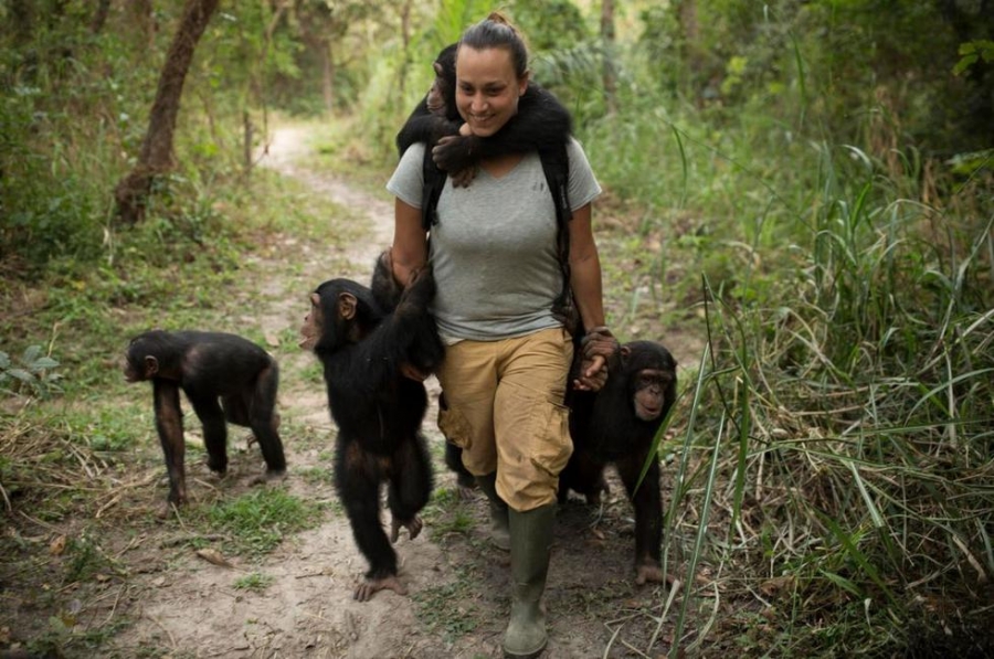 志愿者卡米尔·黎米尔(Camille Le Maire)来自来自法国尼斯(Nice),今年27岁。2015年12月1日的下午,拉米尔身上挂着成群结队的黑猩猩在几内亚丛林中的小路上漫步。