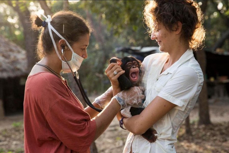 西班牙兽医志愿者克里斯蒂娜(Christina Collell,左)在为保护中心的新成员坎达尔(Kandar)进行健康检查。坎达尔当时只有5个月大,被当地政府从商贩手中救了下来。在保护中心,坎达尔的主要看护人是艾妮莎。