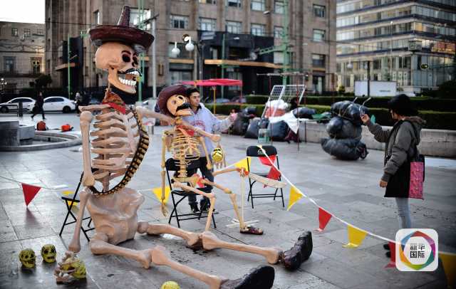 11月1日,在墨西哥首都墨西哥城,人们与骷髅人偶拍照留念。 (新华社/法新)