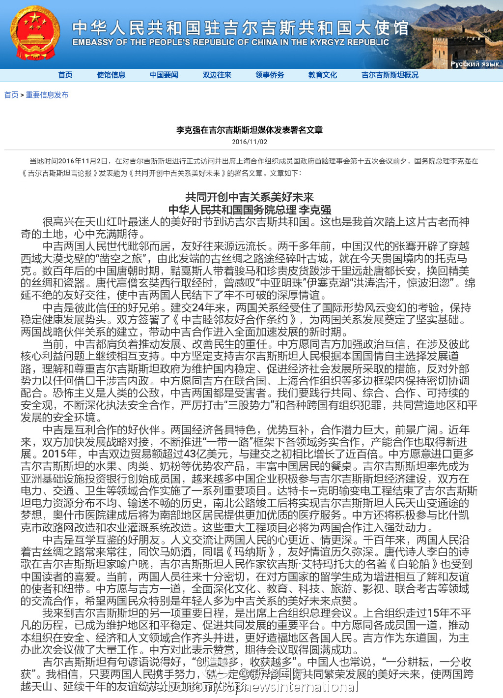 新华网北京11月2日电 李克强总理2日访吉当天在当地最大报纸《吉尔吉斯斯坦言论报》发表署名文章。他说,中吉人民世代毗邻友好,是彼此信任的好兄弟、互利合作的好伙伴、互学互鉴的好朋友。只要两国人民携手努力,就能让中吉两国延续千年的友谊绽放出更加绚丽的光彩。(据“新华国际”微博报道)