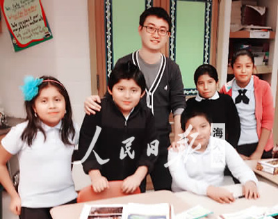 丁申(左三)在英语实践教学课上教小朋友学英语。