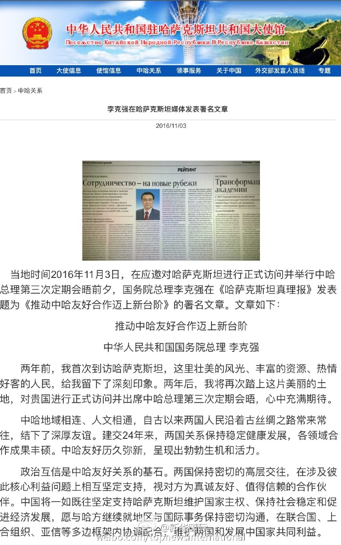 新华网北京11月3日电 在抵达哈萨克斯坦当天,李克强在哈最大报纸《哈萨克斯坦真理报》发表署名文章表示,产能合作是中哈合作中的一大亮点和重要增长点,中方愿与哈方一道,本着开放、协商合作、互利共赢的原则,用实实在在的合作成果惠及两国人民,共同推动中哈友好合作不断迈上新台阶。(据“新华国际”微博报道)