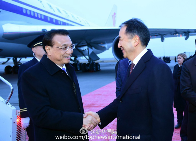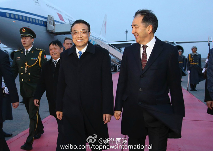 新华网北京11月4日电 当地时间3日下午,李克强乘专机抵达阿斯塔纳国际机场。总理将出席中哈总理第三次定期会晤并对哈萨克斯坦进行正式访问。这是李克强时隔两年再次访哈。哈总理萨金塔耶夫到机场迎接。礼兵沿红地毯两侧列队行注目礼,身着民族服装的哈青年向李克强献上鲜花。(据“新华国际”微博报道)
