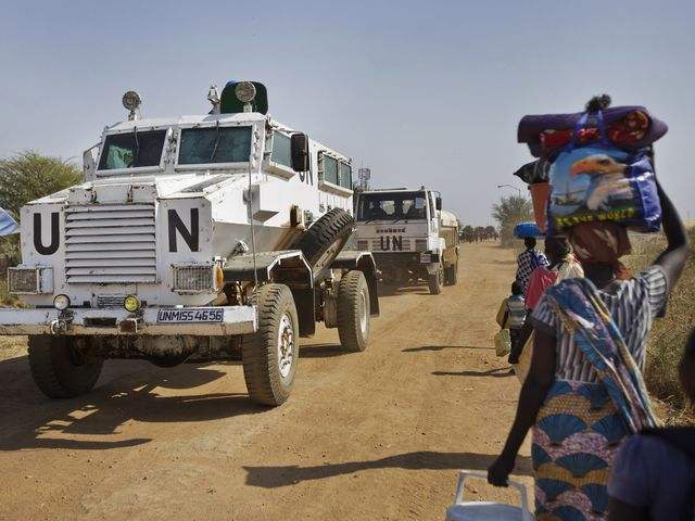 资料:南苏丹马拉卡勒市,联合国维和部队车队向营地驶去。(新华/美联)