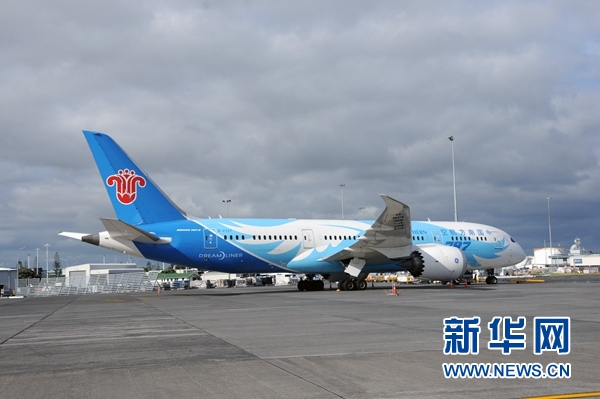 这是2015年12月10日在新西兰奥克兰机场拍摄的,中国南方航空公司执飞新西兰奥克兰至中国广州的波音787型客机的资料照片。新华社记者田野摄