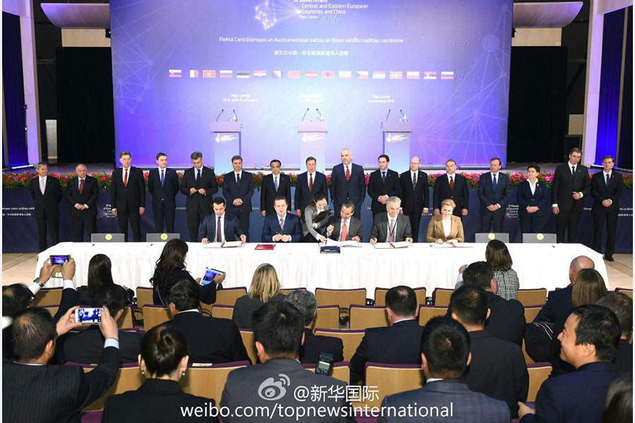 新华网北京11月6日电 当地时间5日下午,第五次中国—中东欧国家领导人会晤后,李克强总理与中东欧16国领导人集体出席签字仪式,共同见证16+1战略对接、金融、民航、科技、教育、地方等领域合作文件签署。随后中拉两国总理为中国—中东欧金融控股有限公司揭牌。(据新华社“新华国际”微博报道)