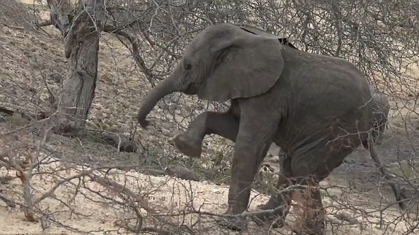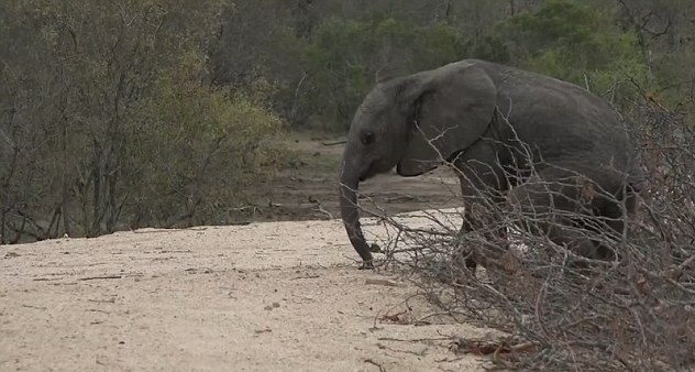 幼象误入荆棘丛后,才猛然意识到它体型太小,难以轻松穿地过丛林。它抬起了前脚掌,却只能悬在半空,不知往何处落脚,还差点因此栽了个跟头。
