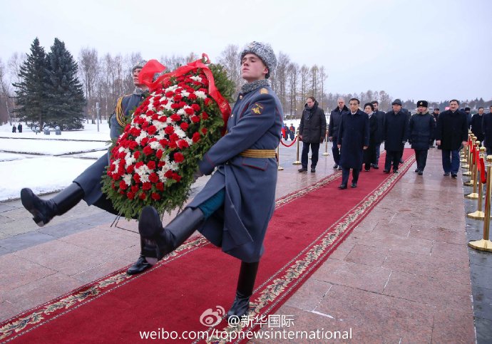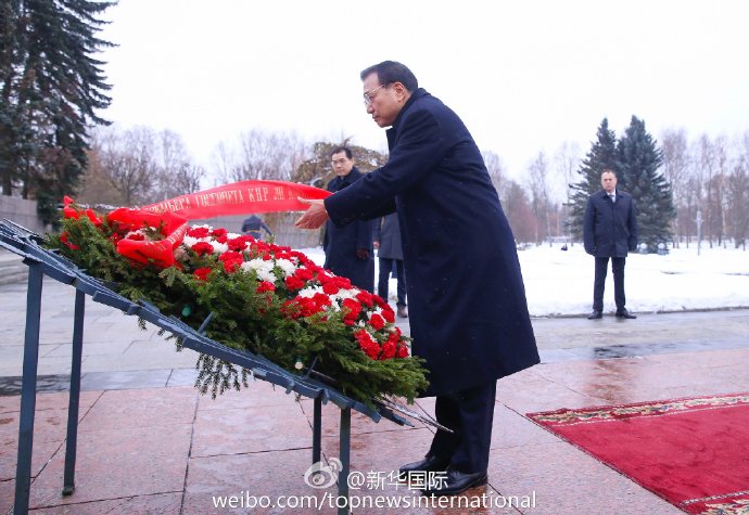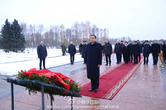 新华网北京11月7日电 当地时间7日上午,正在俄罗斯圣彼得堡访问的李克强冒着严寒来到皮斯卡廖夫公墓向纪念碑献花圈并参观陈列室。李克强说,深切缅怀在世界反法西斯战争中英勇牺牲的烈士,他们保卫了祖国也捍卫了世界和平。向付出巨大代价的人民致敬。(据“新华国际”微博报道)