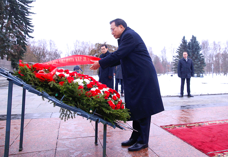 位于圣彼得堡市郊的皮斯卡廖夫公墓,安葬着在世界反法西斯战争中牺牲的近50万烈士和平民。伴随着默哀曲的肃穆旋律,李克强冒着漫天飞雪的严寒天气缓步拾阶而上,向公墓内的祖国母亲纪念碑献花圈。军乐队随即奏响中俄两国国歌,李克强向纪念碑行注目礼,随后在俄高级官员陪同下检阅仪仗队分列式。