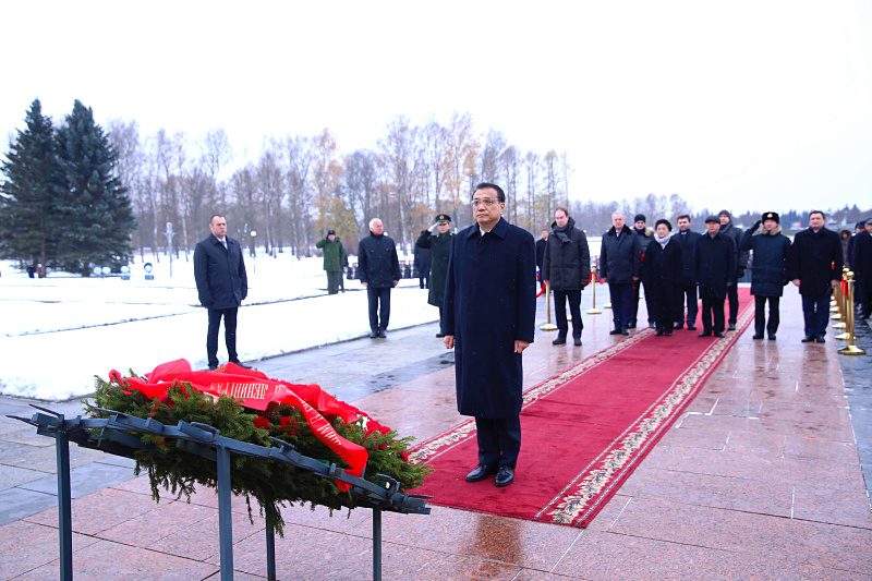 当地时间11月7日上午,李克强总理在俄罗斯圣彼得堡向比斯卡廖夫公墓纪念碑献花圈。