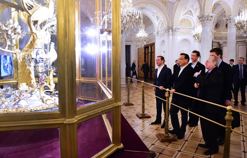 当地时间6日晚,李克强抵达圣彼得堡后,在俄罗斯总理梅德韦杰夫陪同下参观了艾尔米塔什博物馆。艾尔米塔什博物馆收藏了270万件油画、雕塑等艺术品,是著名的艺术盛殿,也是世界最大、最古老的博物馆之一。李克强先后观看了古希腊、古罗马、古埃及等不同文明在不同历史时期经典艺术作品。他多次在展品前驻足,仔细观赏品鉴,并不时与梅德韦杰夫交流。他还观看了拥有200多年历史、被誉为博物馆镇馆之宝的金雀钟,对工匠们的精湛技艺表示赞赏。