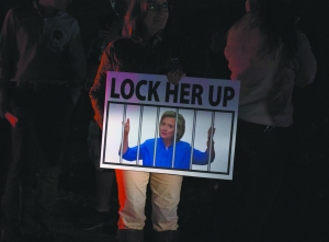 6日,美国弗吉尼亚州,特朗普的支持者高举囚禁希拉里的图片。