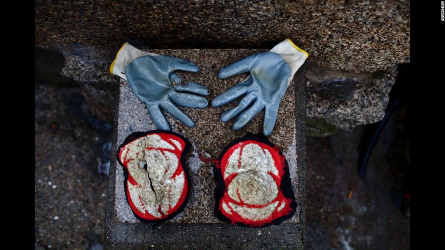 渔人们需要冒着受伤和死亡的危险才能亲手采摘到稀有的昂贵海产品。图为渔人们的护膝和手套,这可以防止他们在水下被锋利的岩石割伤。