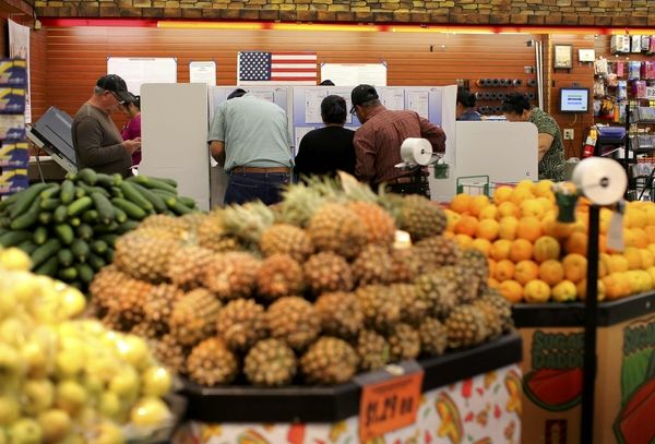 11月8日,加利福尼亚州国民城市,人们在一个设于食品店的投票站投票。(新华/路透)