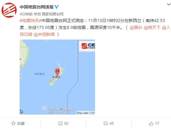 此前中国地震台网测定,11月13日19时02分在新西兰(南纬42.53度,东经173.05度)发生8.0级地震,震源深度10千米,首都惠灵顿震感强烈。