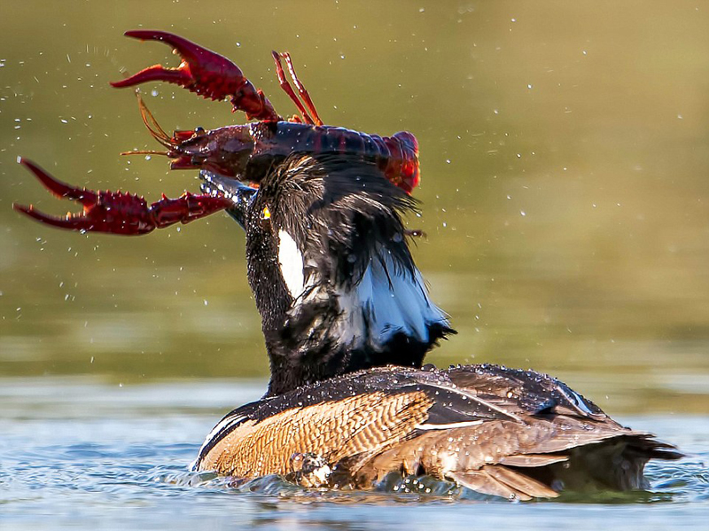 美国摄影师安德鲁·李(Andrew Lee)十分欣赏褐秋沙鸭的雄姿。在得知有数只褐秋沙鸭在加利福尼亚州富勒顿市一个大池塘中栖息时,他便即刻前往,并抓拍到“沙鸭大战小龙虾”的精彩画面。
