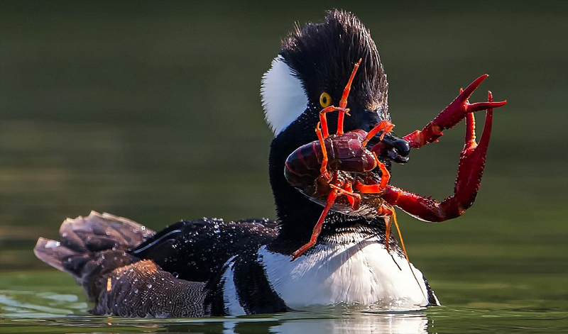 美国摄影师安德鲁·李(Andrew Lee)十分欣赏褐秋沙鸭的雄姿。在得知有数只褐秋沙鸭在加利福尼亚州富勒顿市一个大池塘中栖息时,他便即刻前往,并抓拍到“沙鸭大战小龙虾”的精彩画面。