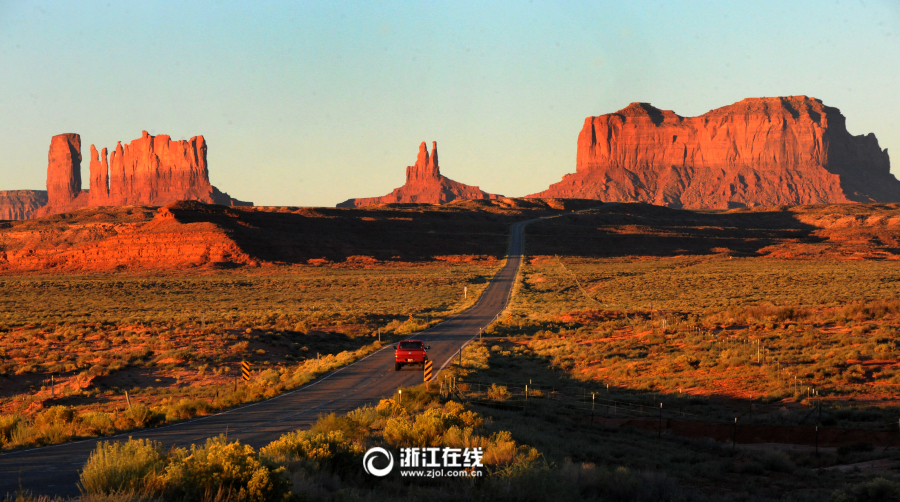 纪念碑谷也是美国西部持久的象征,红色的平顶山矗立在沙漠中,色彩鲜明。