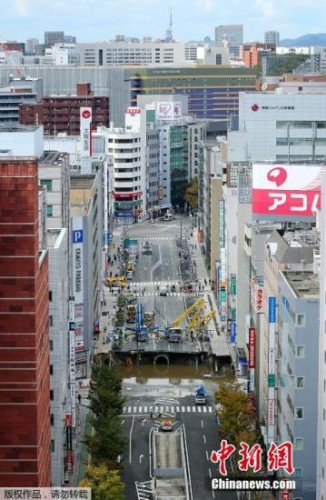 日本博多车站前道路塌方现大坑 一周后恢复通行