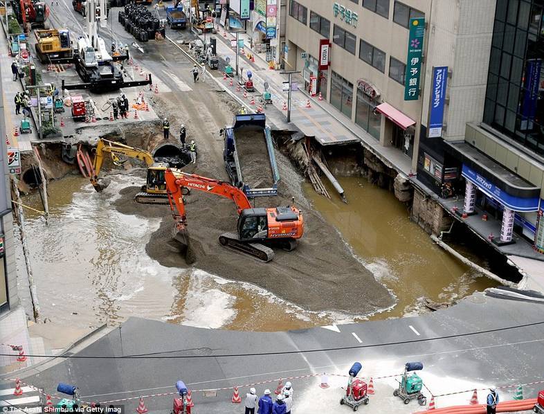 2016年11月8日,日本福冈市JR博多站前道路8日发生大规模塌陷事故,出现一个长约30米、宽约27米、深约15米的大坑,导致交通混乱及停电,未造成人员伤亡。