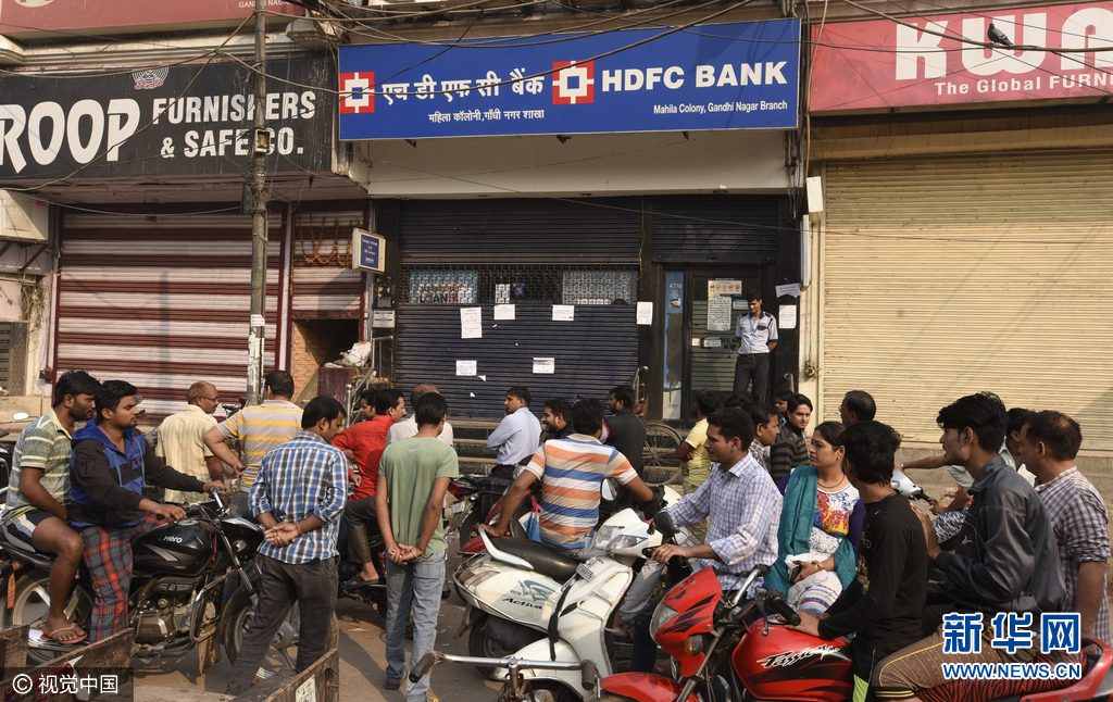 当地时间2016年11月14日,印度民众持续在银行排队兑换新钞,很多自动取款机里的钞票已经被取空。印度总理纳伦德拉·莫迪8日晚突然宣布,当天午夜废除500和1000面额卢比,代之以新版500面额卢比并发行2000面额卢比。人们可凭有效证件从10日至12月30日在邮局或者银行存入这两种旧版货币并以旧换新。图片来源:视觉中国。