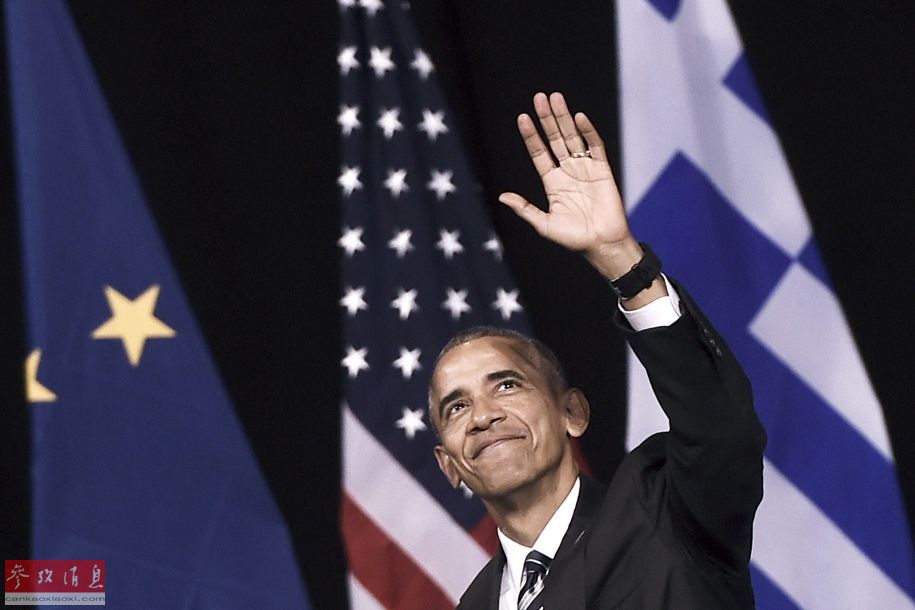 11月16日,希腊雅典,美国总统奥巴马在结束演讲后向人群挥手致意。当日,奥巴马在希腊总理齐普拉斯(Alexis Tsipras)的陪同下,在雅典发表讲话,内容涉及如何处理世界各地区面临的经济挑战,同时促进包容性增长以及解决不平等的问题。