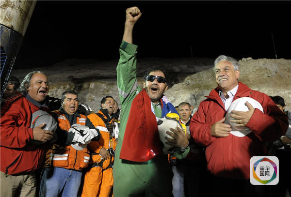 2010年10月13日,最后一名被困矿工路易斯·乌尔祖阿(中)成功升井后与皮涅拉(右)一同庆祝。(新华社发)