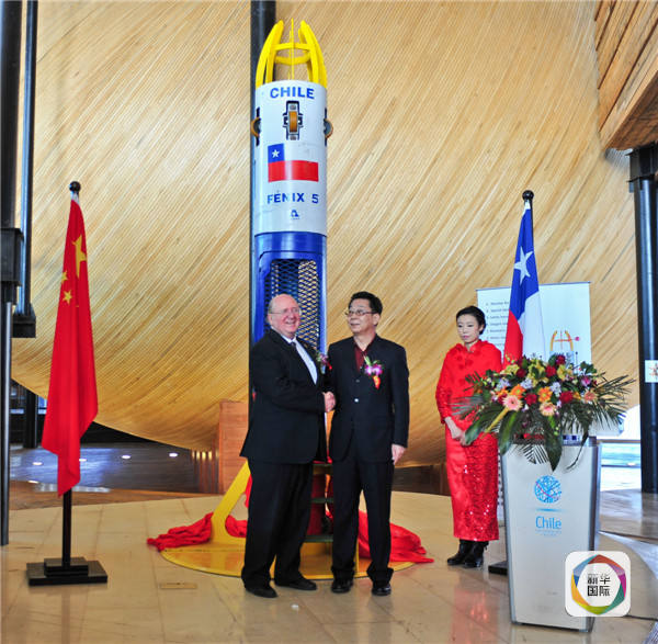 2014年1月10日,时任智利驻华大使路易斯·施密特(左一)与天津凯威投资集团有限公司董事长吴玉凯出席“凤凰5号”揭幕仪式。(新华社记者翟健岚摄)
