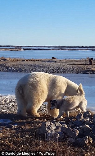 据英国《每日邮报》11月18日,在加拿大的曼尼托巴一位导游拍到了这样有趣的一幕,一头野生的北极熊蹲坐在岸边,用它巨大的爪子抚摸一条雪橇犬,整个画面看起来就好像这条狗是北极熊的小宠物一样。据了解,雪橇犬从小就被主人进行特殊的训练,所以并不惧怕其他的野生动物,但是令人意想不到的是,北极熊据然对这条雪橇犬如此的友好。
