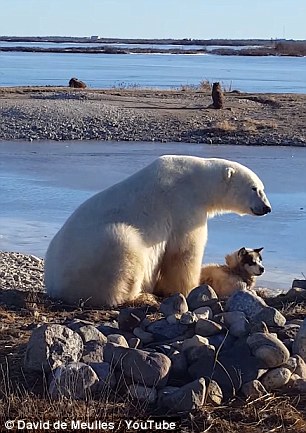 北极熊也想养宠物 蹲坐岸边爱抚萌犬(组图)