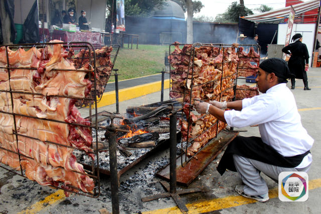 2015年6月20日,秘鲁首都利马举行美食节。图为一名厨师正在制作烤猪。(新华社发 路易斯·卡马乔摄)