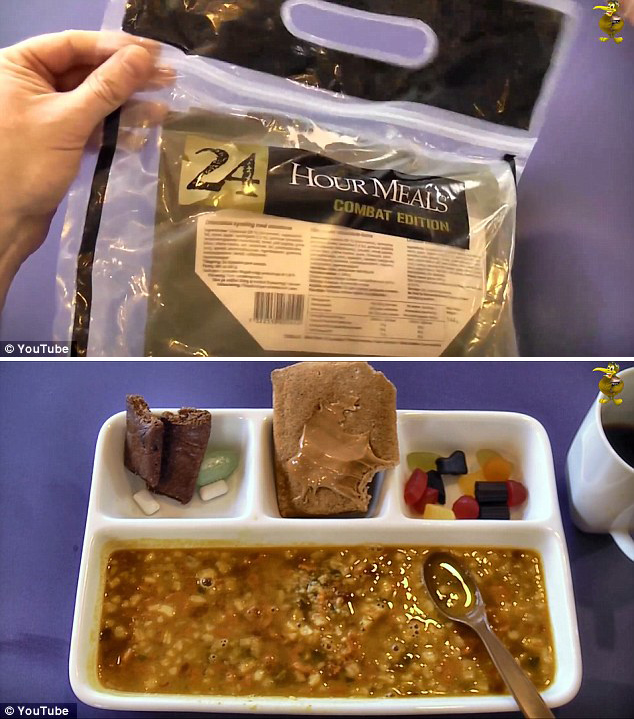 瑞典:东方小米鸡肉饭 包含1300卡热量的午餐包由一个很好的塑料袋和一个小把手组成,袋子里面是一个“战斗版”的太妃糖能量棒、花生酱、咖啡、口香糖、硬糖、和美国牌的全麦包。另外还有冻干的远征饭主菜,只需要热水加热即食。小米鸡肉饭里有青椒,调味的青豆、洋葱、马铃薯淀粉和杏等等。