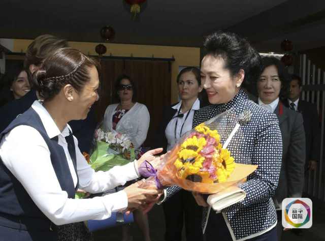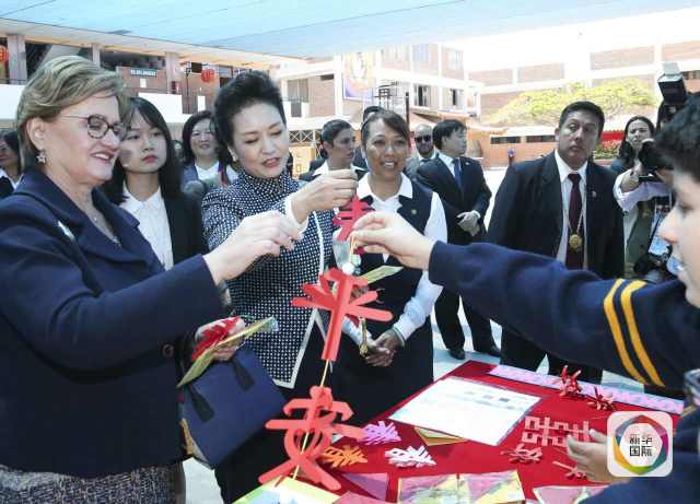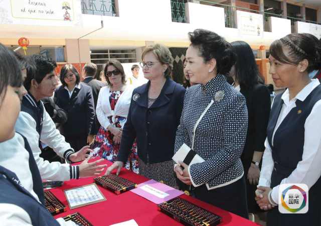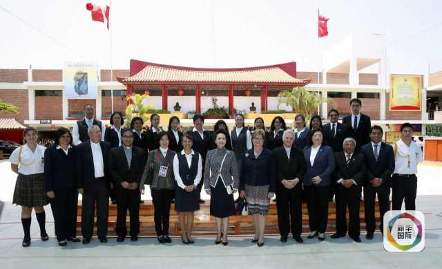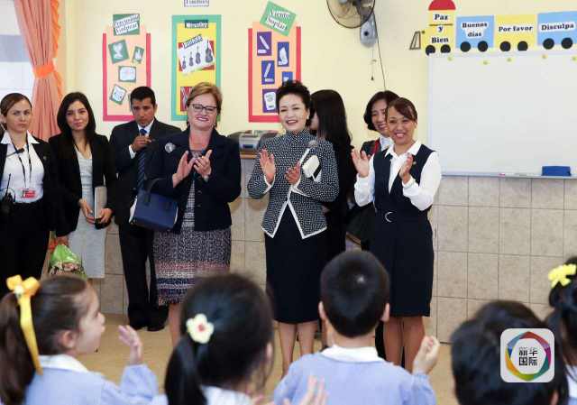 彭丽媛抵达时,秘鲁总统夫人兰格和学校校长在下车处迎接,校长为彭丽媛献上鲜花。若望二十三世秘中学校创办于1962年,是从幼儿园到中学教育的全日制学校,也是秘鲁乃至南美洲最具影响的华文学校之一。