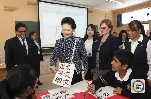 彭丽媛前往初中班教室观摩书法课。十多名学生围坐在三张长桌前练习毛笔书法。他们今天练习的是“朋友”两个字,彭丽媛称赞他们写得很好。她还讲述了中国古代书法家练习书法的故事,告诉学生们学习书法贵在坚持,每天都要练习。