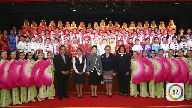 在学校礼堂,彭丽媛观看学生文艺演出。学生们表演了合唱《歌声与微笑》《在希望的田野上》,中秘儿童服装表演、武术和扇子舞等。演出结束后彭丽媛与全体演员合影,感谢他们的精彩演出。