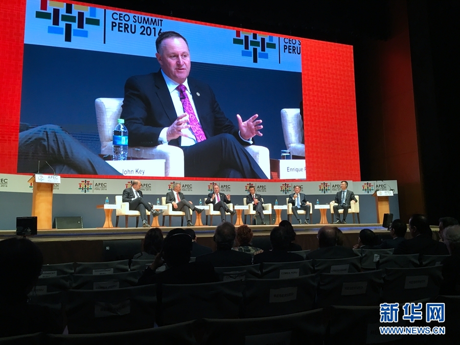 当地时间11月19日,APEC工商领导人峰会举行主题为“重新设计贸易”的现场讨论会。图为新西兰总理约翰·基在讨论会上发言。
