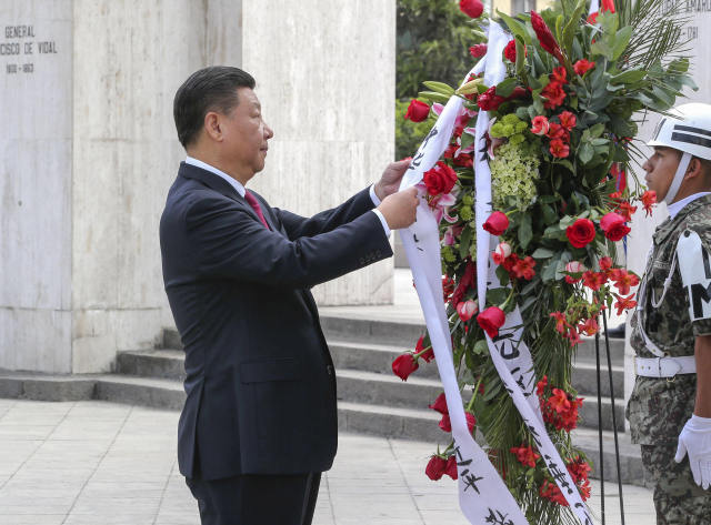 11月21日,国家主席习近平在利马同秘鲁总统库琴斯基举行会谈。会谈前,在库琴斯基夫妇陪同下,习近平和彭丽媛向秘鲁独立先驱纪念碑敬献花圈。(新华社记者 丁林 摄)