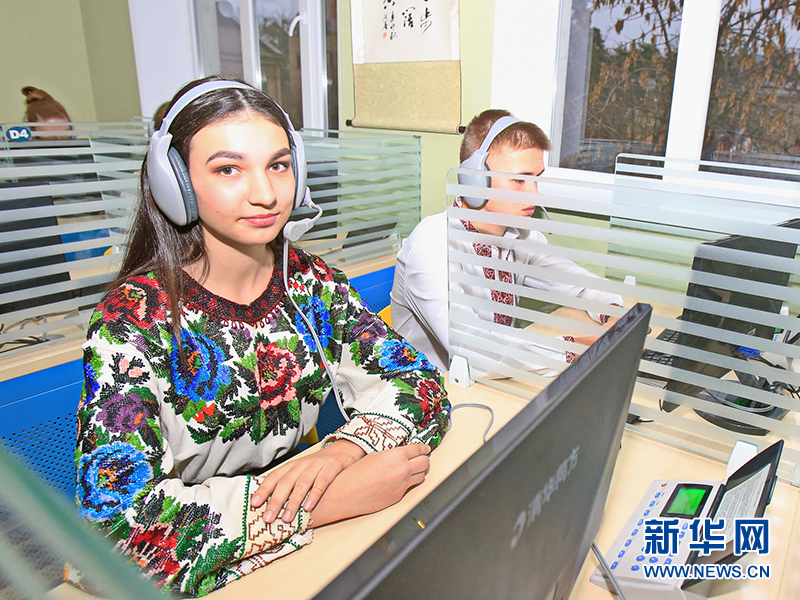 乌克兰中学生在新的视听教室里学习。新华网记者 陈俊锋摄