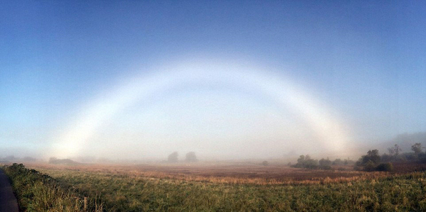 报道称,当地时间11月20日,尼科尔森漫步在兰诺克沼泽地上,突然看到这个水雾幻影,他被眼前神秘的白色雾虹美景惊呆了,于是迅速拿出相机拍摄下来。他表示:“在这以前,我从未见过雾虹,但那天的美景将终生镌刻在我的脑海中。”