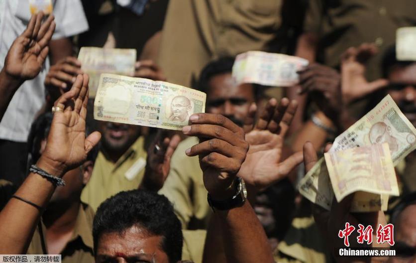 当地时间2016年11月23日,印度金奈,民众抗议废除大面额纸币。8日晚,印度总理莫迪突然宣布,从9日起废止面值500卢比和1000卢比的两种大钞,以打击腐败和黑钱交易。