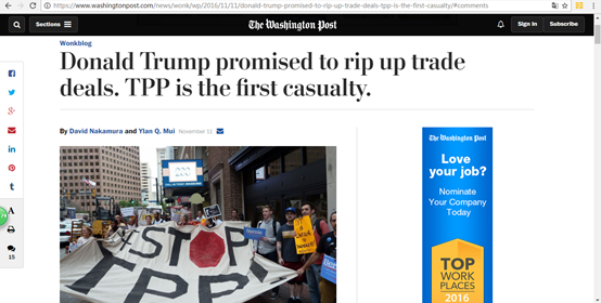 《华盛顿邮报》发表文章称,特朗普自竞选时就一直反对TPP和北美自由贸易协定等,击中了选民们的痛点。特朗普曾痛斥自由贸易可能会逼得美国制造业工人没饭吃。