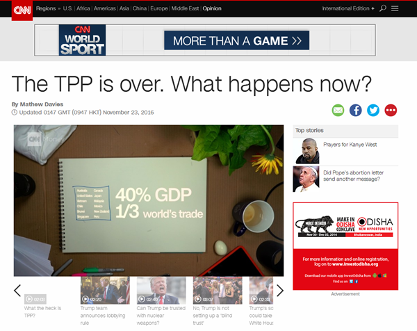 美国有线电视新闻网(CNN)和华尔街日报都回顾了TPP签署后美国国内的分歧和内耗,CNN发表了题为《TPP完蛋了,现在怎么办?》的文章称,希拉里、桑德斯等大选候选人都表示反对TPP。《华尔街日报》则认为特朗普反对TPP主要是在跟奥巴马翻旧账。