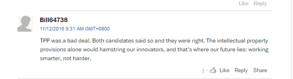 TPP是个很糟糕的交易,两位竞选人对TPP说不,都是对的。单单TPP中有关知识产权的条款就能扼杀我们的创新能力,而创新是我们的未来。