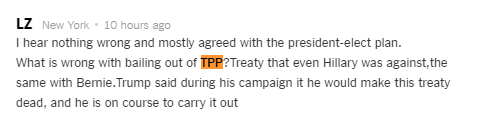 正如美媒所言,特朗普宣称退出TPP,击中了民众的焦虑痛点。许多美国网友纷纷表达了对特朗普的支持。