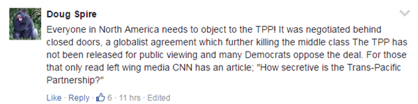 北美洲每个人都应该站出来反对TPP!在谈判的时候都是暗箱操作,打着全球化的旗号进一步扼杀中产阶级。这就是为什么公众都没见过TPP协议的内容以及众多民主党人公开反对。