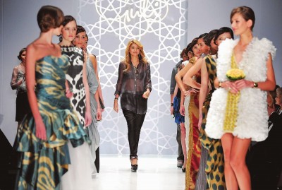 图片说明: 曾被视为乌总统“接班人”的卡里莫娃 (中) 涉足颇多领域,比如时尚圈。图为当年在俄罗斯秋冬时装周上,卡里莫娃作为设计师走T台。视觉中国
