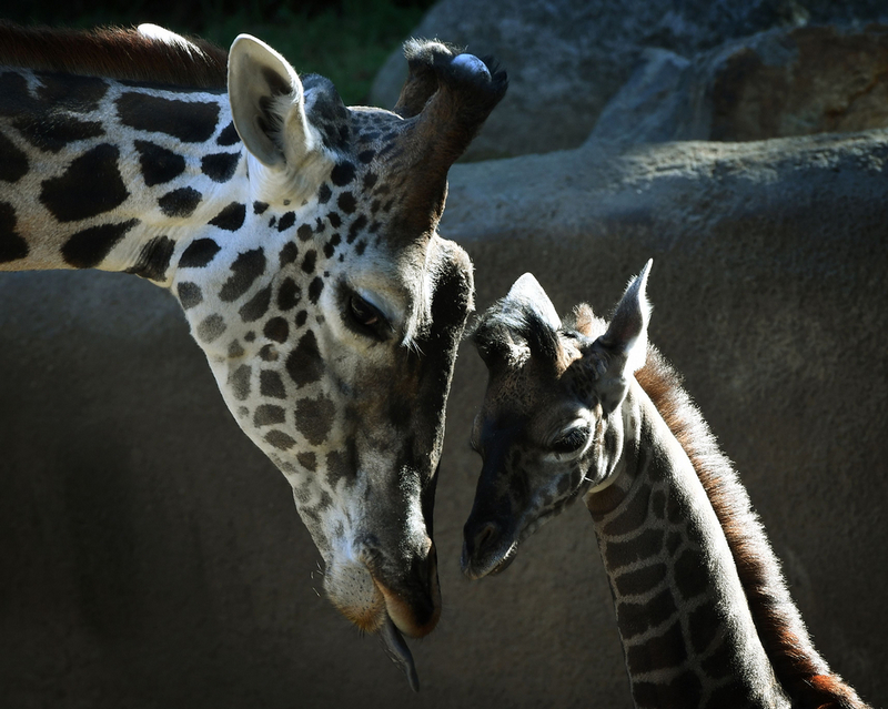 有爱!美动物园新出生长颈鹿与父亲亲密碰头(组图)