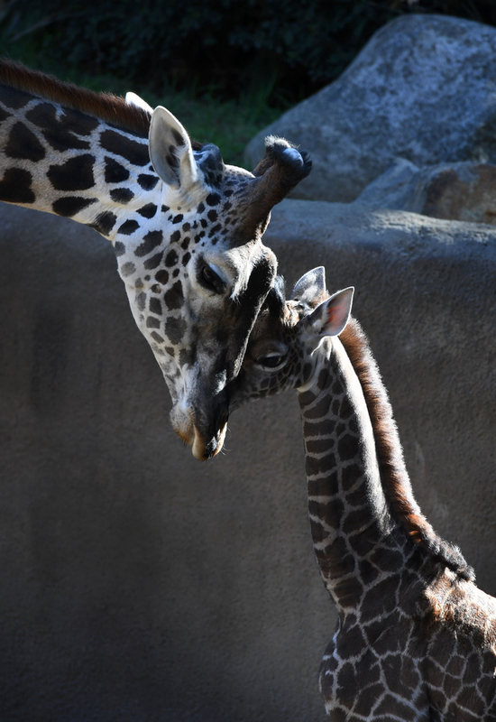 有爱!美动物园新出生长颈鹿与父亲亲密碰头(组图)