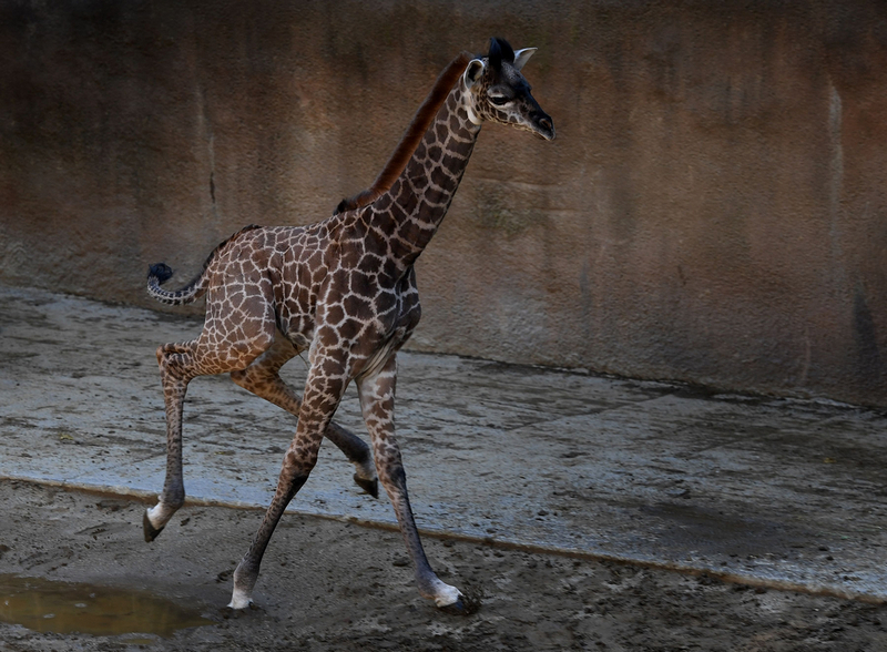 当地时间2016年11月22日,美国洛杉矶,洛杉矶动物园里新添一名小成员,两周前诞生一只雌性长颈鹿。小长颈鹿尚未命名,正和父亲Phillip玩耍嬉戏。